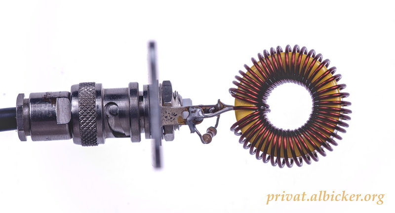 Die Spule ist realisiert durch einen Ferrit-Ringkern mit aufgebrachter Wicklung aus Kupferlackdraht - fertig zu beziehen z. B. bei Pollin.