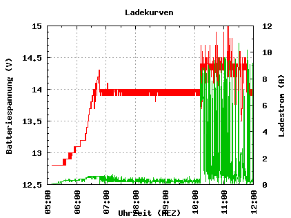 Diese beiden Diagramme (Ende Mai, Raum Karlsruhe) zeigen bis 10:12 Uhr das Verhalten bei voller Batterie (Erhaltungsladung), ab 10:12 Uhr ist hier der Kompressorkühlschrank als Verbraucher in Betrieb, damit gleichen die Kurven wieder den obigen Diagrammen. |
